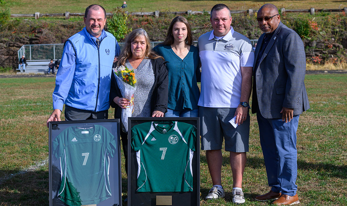 The ceremony was held before the start of the women’s soccer game against Bay Path University. In another fitting tribute that would have made Cummings proud, they won 8-1.