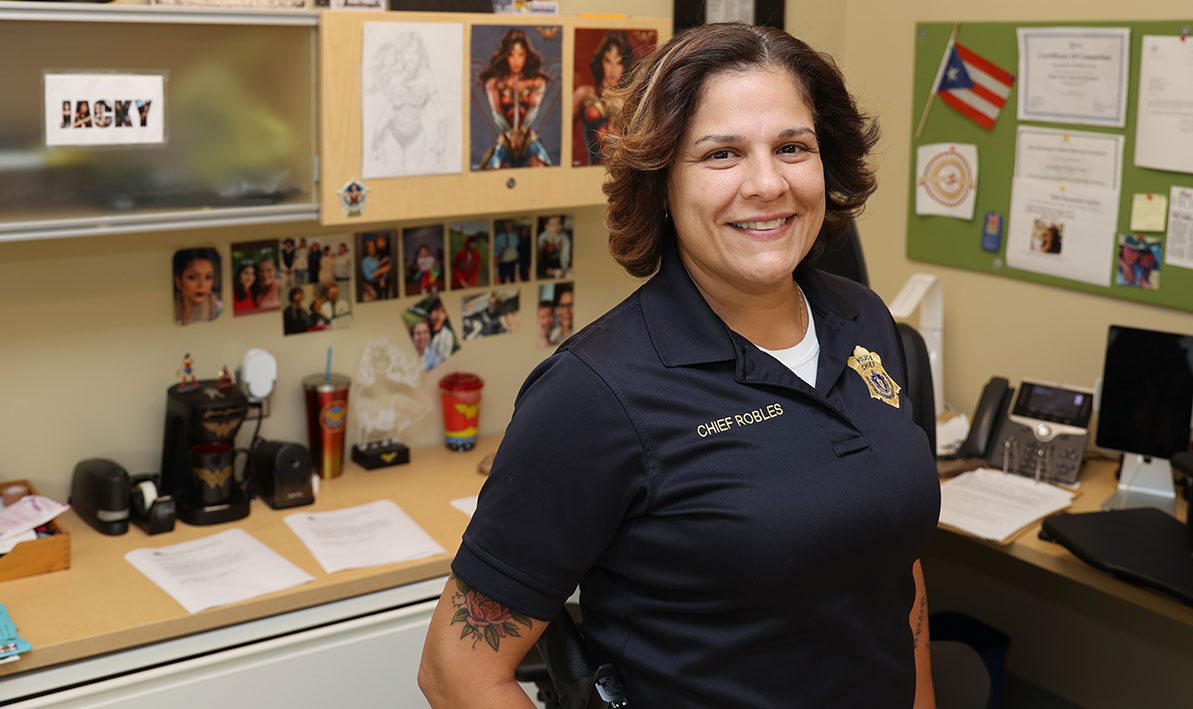 If you know anything at all about HCC Police Chief Jacky Robles, you know she’s a huge fan of Wonder Woman. Her office is filled with images, photos, and other knick-knacks and tchotchkes celebrating the Amazonian demi-goddess of superhero lore – not to mention the large Wonder Woman tattoo she sports on her left arm. Since being sworn in last April as HCC’s new police chief – and the first Latina to hold that position – Robles has received a slew of recognitions, including a Commonwealh Heroine award from the Massachusetts Commission on the Status of Women. “Oh, my gosh, that was incredible. I couldn’t believe it,” she recently said. “Then I had to chuckle a bit, because, obviously, I’m a total fan of Wonder Woman, and it’s a heroine award, and Wonder Woman is a heroine.” She was invited to the State House for the awards presentation, where state Rep. Carlos Gonzalez from Springfield surprised her with an acknowledgment on the floor of the House and proclamations from both the House and Senate, to go along with a citation recognizing her as civil service ambassador for the Springfield Puerto Rican Day Parade. (And – spoiler alert: In October, she will be recognized with a “100 Women of Color” award from the Massachusetts Women of Color Coalition.) The recognitions are exciting, she says, but she takes seriously the superhero credo, “with great power comes great responsibility,” and knows there are a lot of people looking to her for leadership. “I’m very humbled,” she said. “I don’t want to let anybody down, especially all the girls from my family. I’m happy and I’m proud, and I’m here, trying to make some moves, positive ones.” PHOTO: Police Chief Jacky Robles, in her HCC office.
