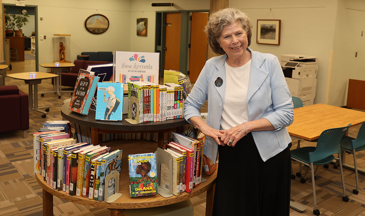 When asked where she would like to pose for a photograph to accompany a story about her recent HCC appointment, Katherine Douglas, the interim vice president of academic and student affairs, did not demur. “The HCC Library,” she announced. “I want to be near books. They still have books there, don’t they?” Indeed, they do. Fittingly, she stood next to stack of them arranged on a table in the library lobby under a placard that said, “New Arrivals.” Although Douglas started her interim post on August 4, this is not her first HCC go-round. She served as dean of social sciences from 2005 to 2008. After completing her doctorate, she took a position as vice president of academic affairs at Sussex Community College in New Jersey and was later hired as president of Corning Community College in upstate New York, from which she retired in 2019. “But I wasn’t really retired,” she said. Through a national registry, she was called back into service for a brief stint as interim president of Monroe Community College in Rochester, N.Y., moving to South Hadley in 2021 after her term at Monroe concluded. In 2023, she joined the HCC Foundation Board of Directors, stepping down when offered the interim VP position. “The reason I considered it was, one, it was Holyoke Community College, which I knew, and two, because I live right across the river,” Douglas said. Although a lot of the people she worked with the first time have retired, there are still plenty of familiar faces, she said, including Carl Todd, coordinator of library services, who took a photo of Douglas back in the day for the HCC Library’s “Read” campaign, the framed poster of which she’s kept all these years and now sits on a bookcase behind her HCC office desk. PHOTO: Katherine Douglas, interim vice president of academic and student affairs, poses next to the New Arrivals table in the HCC Library.