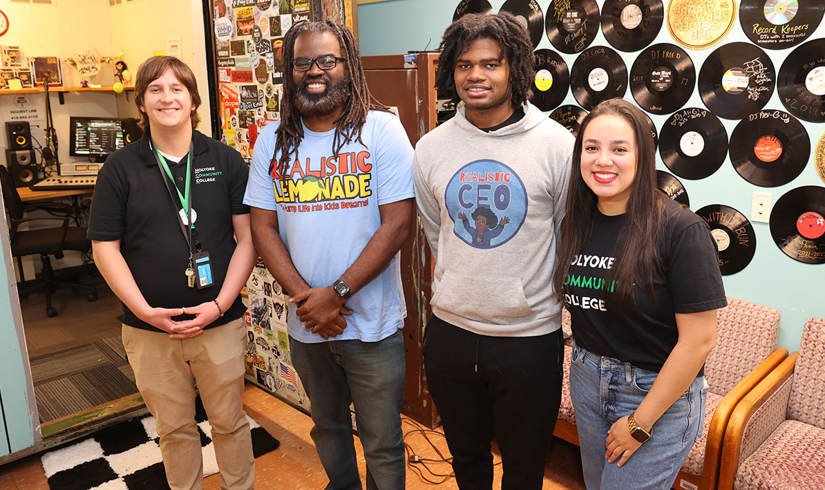 According to East Asian mythology, an invisible thread connects people destined to meet. At Holyoke Community College, “The Green Thread” is a new monthly podcast highlighting the educational journeys, achievements, and insights of HCC alumni. “At HCC, we believe these meaningful connections shape our alumni’s journeys long after graduation,” said Natalia Castagno, assistant director of alumni relations and co-host of The Green Thread podcast along with Patrick Labelle, manager of the college radio station, WCCH-103.5 FM. “We’re inviting alumni to share their stories – exploring the connections, experiences, and threads that tie them to their alma mater, their communities, and one another.” Episode 1 debuted Oct.1 on Spotify. The first guests were alum Myke Connolly ’04, founder of the multimedia company Launch and Standout, and his son, HCC communications major Mikey Connolly, founder of the Realistic CEO podcast, an interview show he started in high school. During their half hour interview, the Connollys discuss entrepreneurship, having a millionaire’s mindset, starting the day with an attitude of gratitude, resilience, and their experiences at HCC. “The beauty of this school … people just let me be me … they embraced me, and I felt normal here," said Myke Connolly, who had immigrated to the U.S. from the Bahamas. "I felt like I belonged here. It was always a welcoming environment. I know I wouldn’t be the man I am today if I wasn’t for HCC. It’s been a pivotal part of everything I’ve done.” Listen here, The Green Thread, Episode 1 … PHOTO: In the WCCH studio with Green Thread postcast hosts Pat Labelle, far left, Natalia Castagno, far right, and Green Thread guests Myke Connolly '04, second from left, and Mikey Connolly