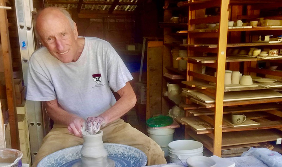 If you ever find a piece of pottery half buried in the sand of a Provincetown beach, there’s a good chance it was left there by HCC Physics Professor Robert Greeney. A small label from “Wandering Mug Pottery” will leave no doubt: “Take it, leave it, use it, give it away. Let the piece wander the world.” A writer recently discovered one of Greeney’s creations in a Provincetown playground and wrote a story about it for the Provincetown Independent, “A Potter Lets His Work Wander.” Greeney, who has a ceramics studio in his Amherst home, estimates he has let wander about 100 pieces of pottery over the years, and Provincetown is one of his favorite places to visit. The objective, he told writer Beth Greenfield, is “spreading playfulness.” “This is a mug. You found it. Have a relationship with it,” he said. Greeney’s wandering pottery project was inspired by an HCC student who took one of his mugs to Paris and left it there for someone else to find. He said he gets a thrill whenever he receives a message from someone who has found one of his pieces. “One-on-one feedback is joyful for me,” he told Greenfield. He told us that, while there is a lot of science involved in ceramics, pottery and physics are vastly different. “I think ‘counterpoint’ or ‘complement’ is a better term than ‘escape,’” he said. “Physics is a very mental/cerebral experience, whereas ceramics is a much more visceral/physical experience.” When contacted for this blog piece, Greeney said he preferred not to say too much more. He wanted to keep the focus on the college. “HCC is a place of diverse people with broad and diverse interests,” he said, “where generosity, sharing, collaboration, and community are important.” PHOTO: HCC Physics Professor Robert Greeney at work in his home ceramics studio.