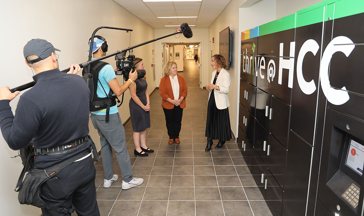 If you were on the second floor of the Campus Center Tuesday morning (Oct. 21), you might have seen what looked like a movie crew carrying cameras and a long boom microphone following a few people through the cafeteria on their way to the Thrive Center and Food Pantry. Close. It was actually a video crew from the Wall Street Journal on campus filming a feature piece on food insecurity. The team is working with Hyundai Motor America, which has been a financial supporter of the Thrive Center over the past few years, along with HCC Foundation board member Gary Rome, owner of Gary Rome Hyundai. The six-person video crew recorded HCC staff members Amanda Sbriscia, vice president of institutional advancement, and Julie Phillips, director or development, as they talked to Lori Chatel, Gary Rome’s executive assistant, about the college’s efforts to combat food insecurity. (We'll let you know when the story comes out.) PHOTO: Sbriscia talks about Thrive's new refrigerated lockers.